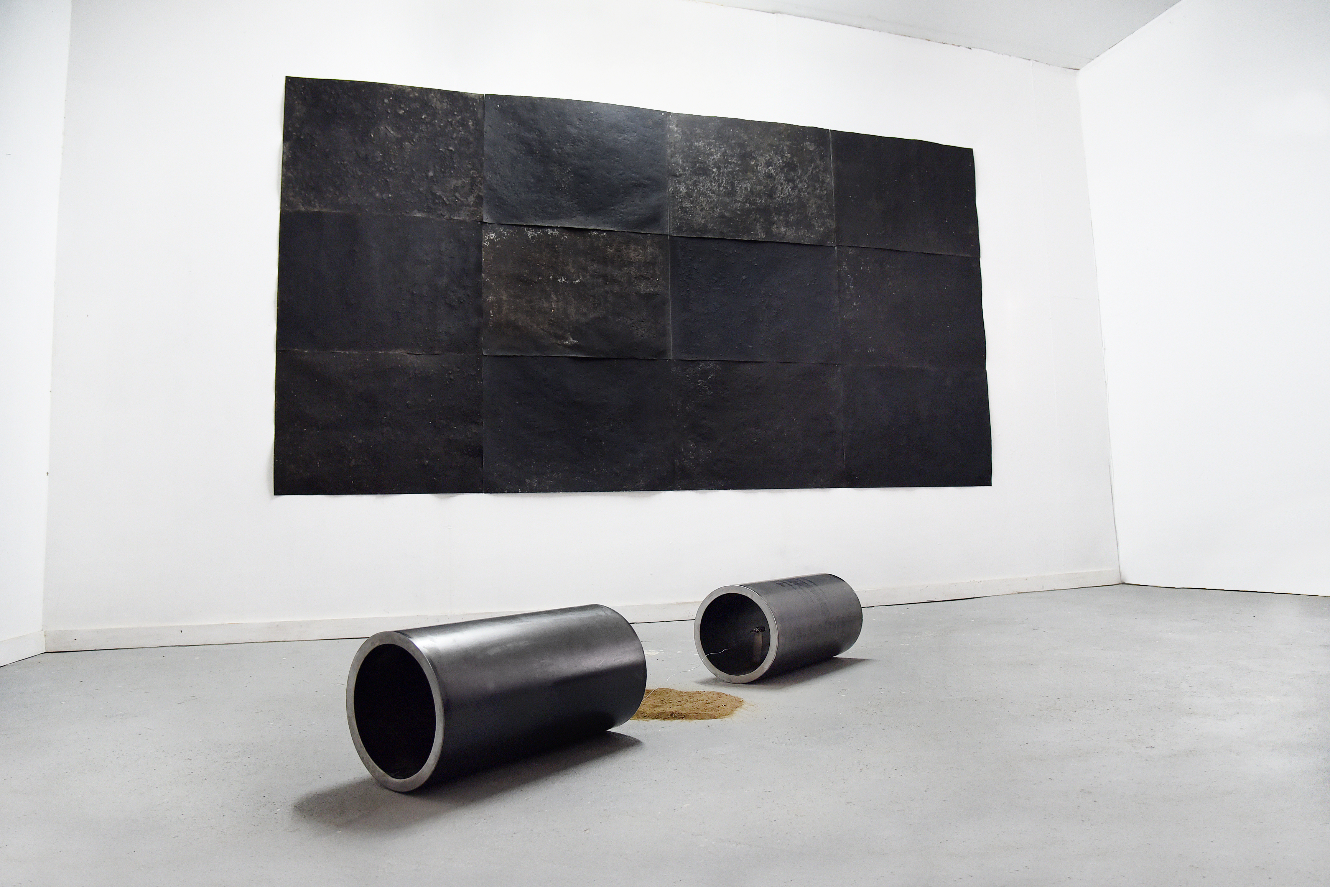 Moreover, this installation also consists of an audible sculpture which communicates with its posterior part, the collography. Undoubtedly, the most important part while printing these monotypes were the metallic cylinders of the engraving press. A tool which was directed from two metallic tubes giving the impression of a dialogue. Those metallic tubes, are the ones further embracing and defining the material’s weight. At the same time, another conceptual dialogue takes over. The one between the adjacent presses and the metallic wire, under the assistance of an electric motor. The constant wire motion leaves its imprint on sandy soil, carving it in such a way so it cages between the industrial materials. In the first instance, soil, the same material used for the monotypes, stands still. Like a handful of soil at a starting point. But following the wire’s motion, it gains momentum and ends up far away from the audible sculpture.